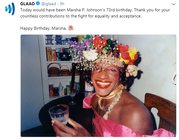 pastelgrandpa Ikke kategoriseret 25. august 20185. december 2018 1 Minute bi-trans-alliance: Today (Aug 24 2018) would’ve been Marsha P. Johnson’s 73rd birthday. Del dette: Share on X(Åbner i et nyt vindue) X Del på Facebook(Åbner i et nyt vindue) Facebook Like Henter... Relateret Offentliggjort af pastelgrandpa Vis alle indlæg af pastelgrandpa Udgivet 25. august 20185. december 2018